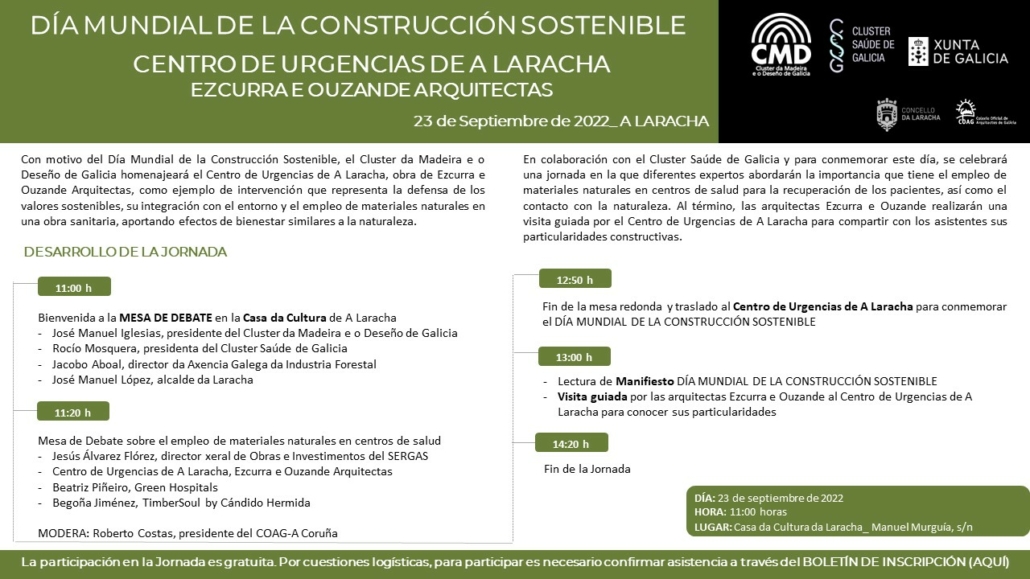 El próximo 23 de septiembre, con motivo del Día Mundial de la Construcción Sostenible, el Cluster da Madeira e o Deseño de Galicia, en colaboración con el Cluster Saúde de Galicia, celebrará una jornada en la que diferentes expertos abordarán la importancia que tiene el empleo de materiales naturales en centros de salud para la recuperación de los pacientes, así como el contacto con la naturaleza.